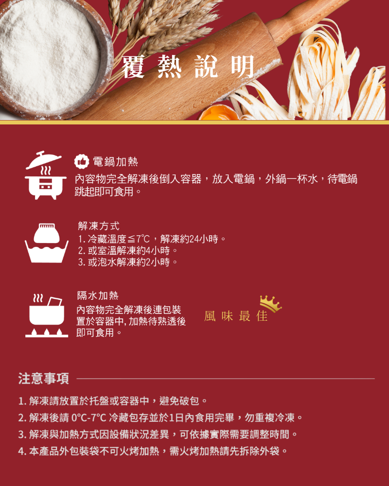 食用建議:本產品開蓋後請於當餐食用完畢,勿隔餐再食