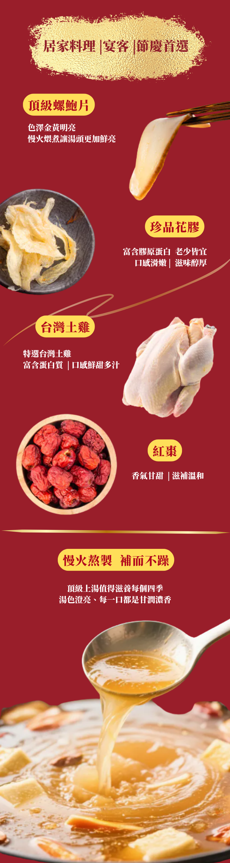 嚴選頂級珍貴花膠與鮑片,搭配鮮嫩土雞,
