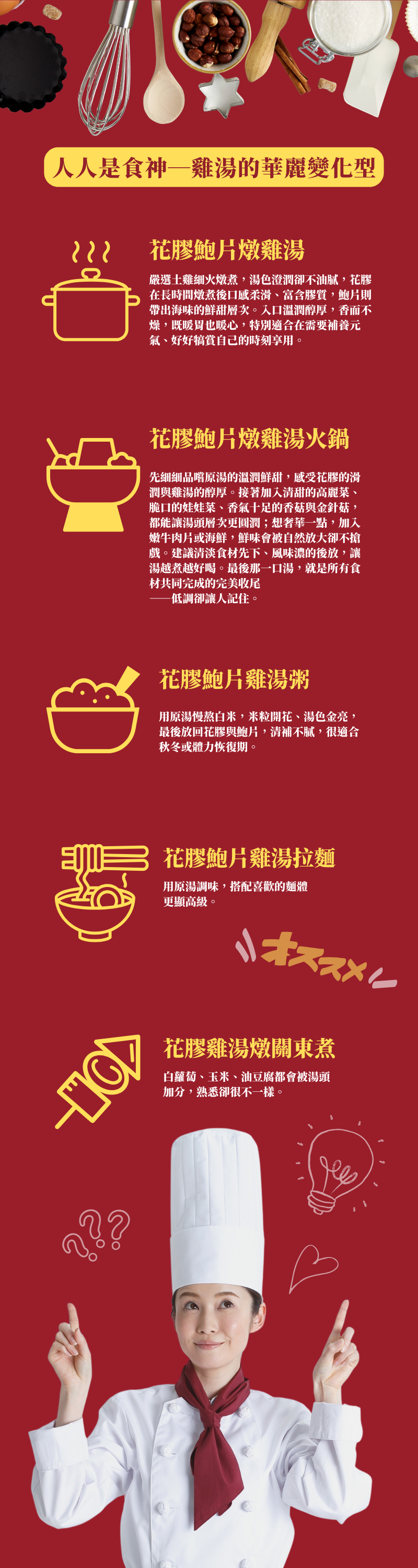 成分:水、全雞、花膠(魚膘)、鮑螺片、豬腳、小冬菇、紅棗、食鹽、高鮮味素(L-麩酸鈉、胺基乙酸、DL-胺基丙酸、琥珀酸二鈉、5,-次黃嘌呤核苷磷酸二鈉、5,-鳥嘌呤核苷磷酸二鈉)