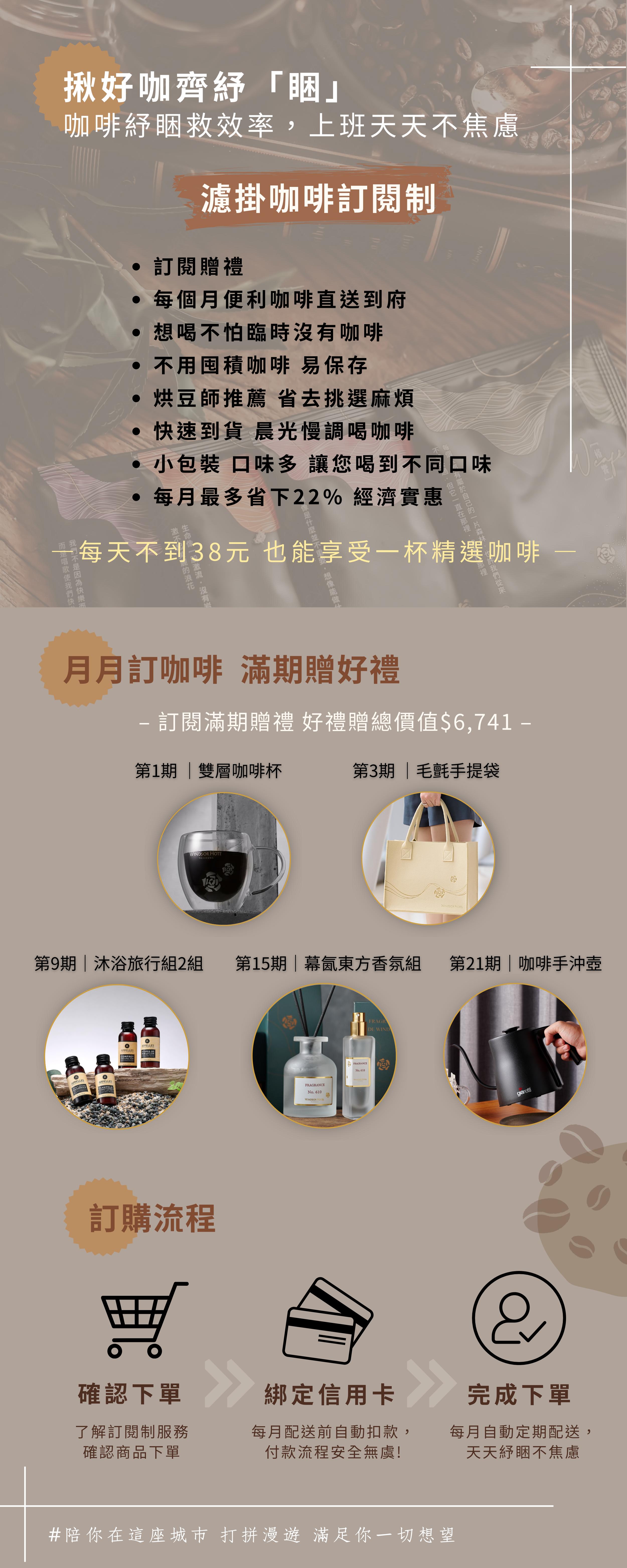 濾掛咖啡訂閱制方案,每個月會自動產生訂單、自動扣款,且均享免運!