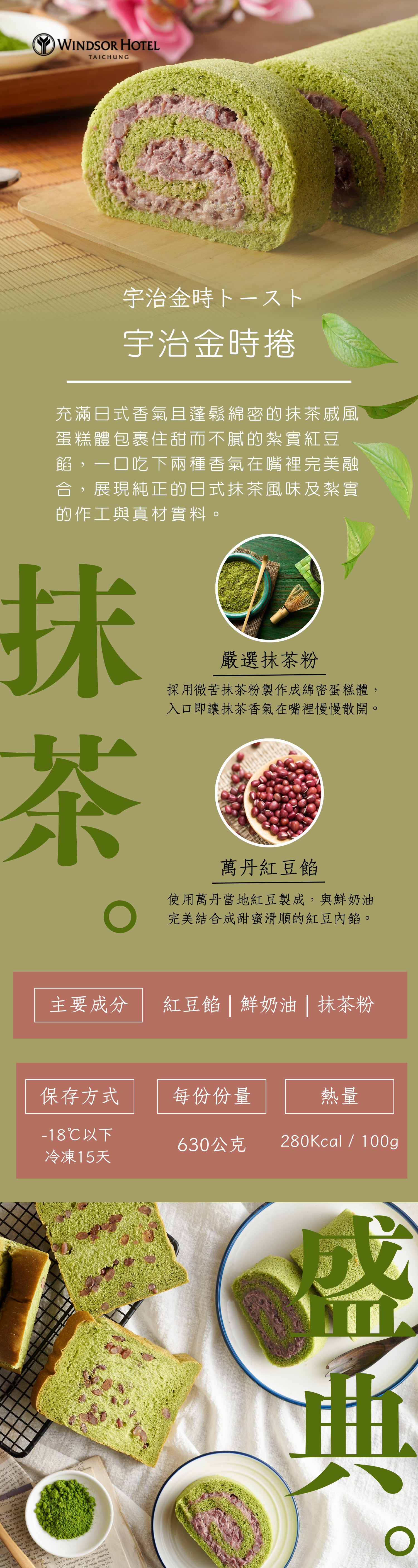 充滿日式香氣且蓬鬆綿密的抹茶戚風蛋糕體包裹住甜而不膩的紮實紅豆餡,