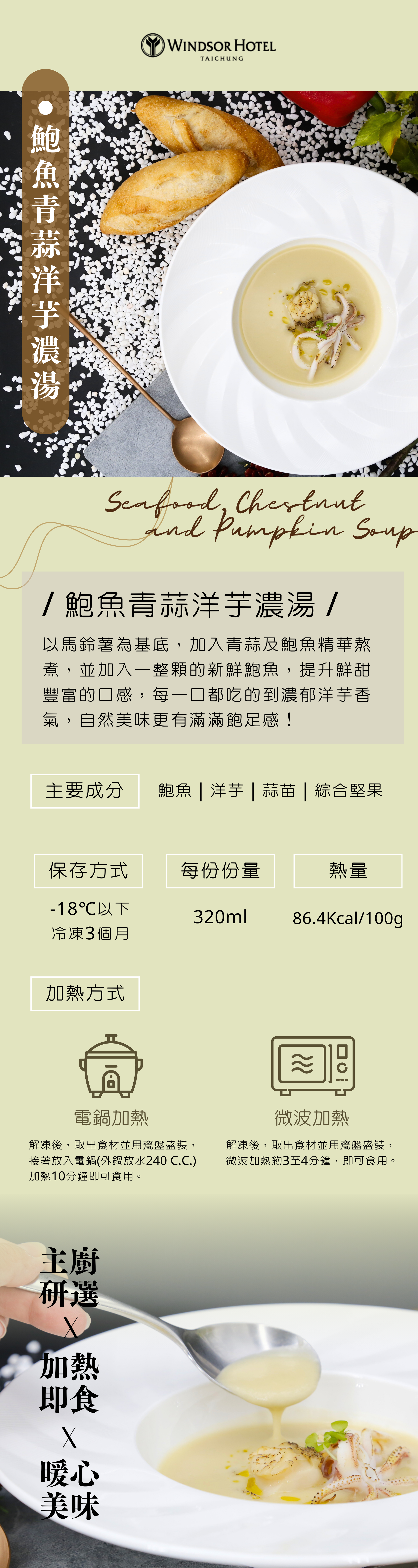 以馬鈴薯為基底,加入青蒜及鮑魚精華熬煮